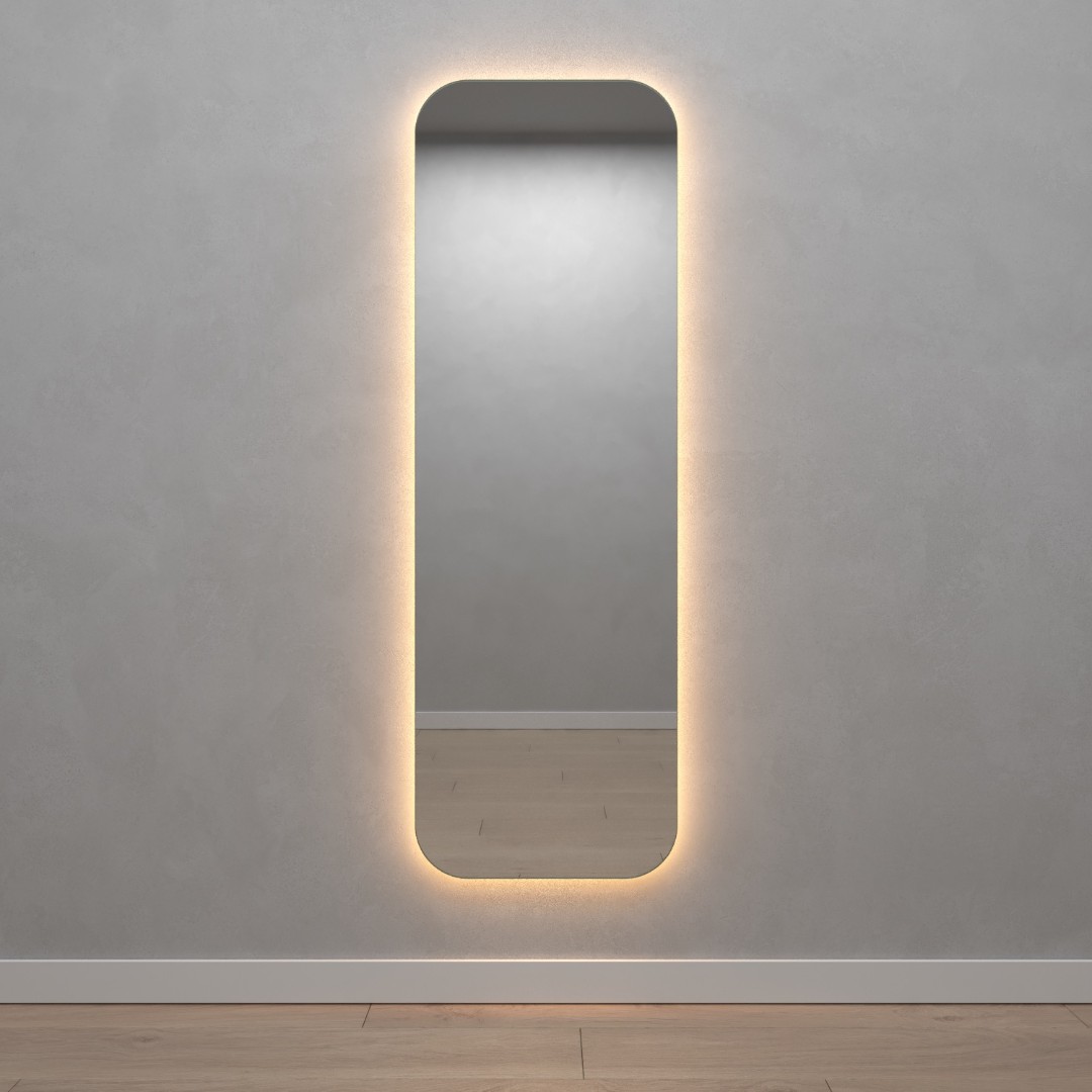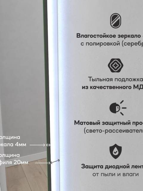 Безрамное зеркало прямоугольной формы с контурной (тыльной) тёплой подсветкой, свет 3000К. Подложка из высококачественного МДФ, светодиодная лента защищена матовым свето-рассеивателем от попадания пыли и влаги. Есть вывод 220W для подключения к сети, включение подсветки от сенсорной кнопки на зеркале, её расположение на зеркале можно выбрать на заказ.